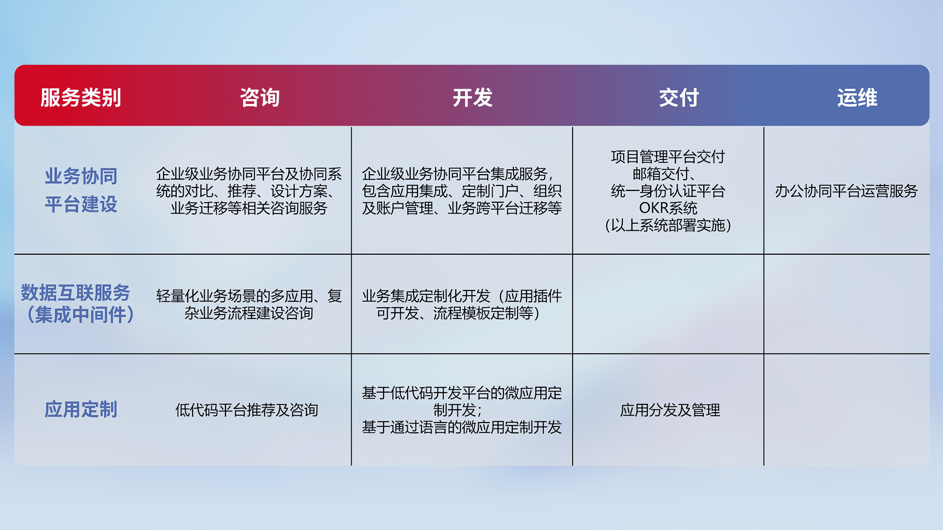 针对钉钉、、、、企微、、IDaas等平台级产品提供产品的规划、、方案、、、交付、、定制化开发等服务,,实现如统一协同办公、、、智能客户服务、、、混合会议管理、、智能数据查询、、、、等业务场景,,实现数字化转型。。。。