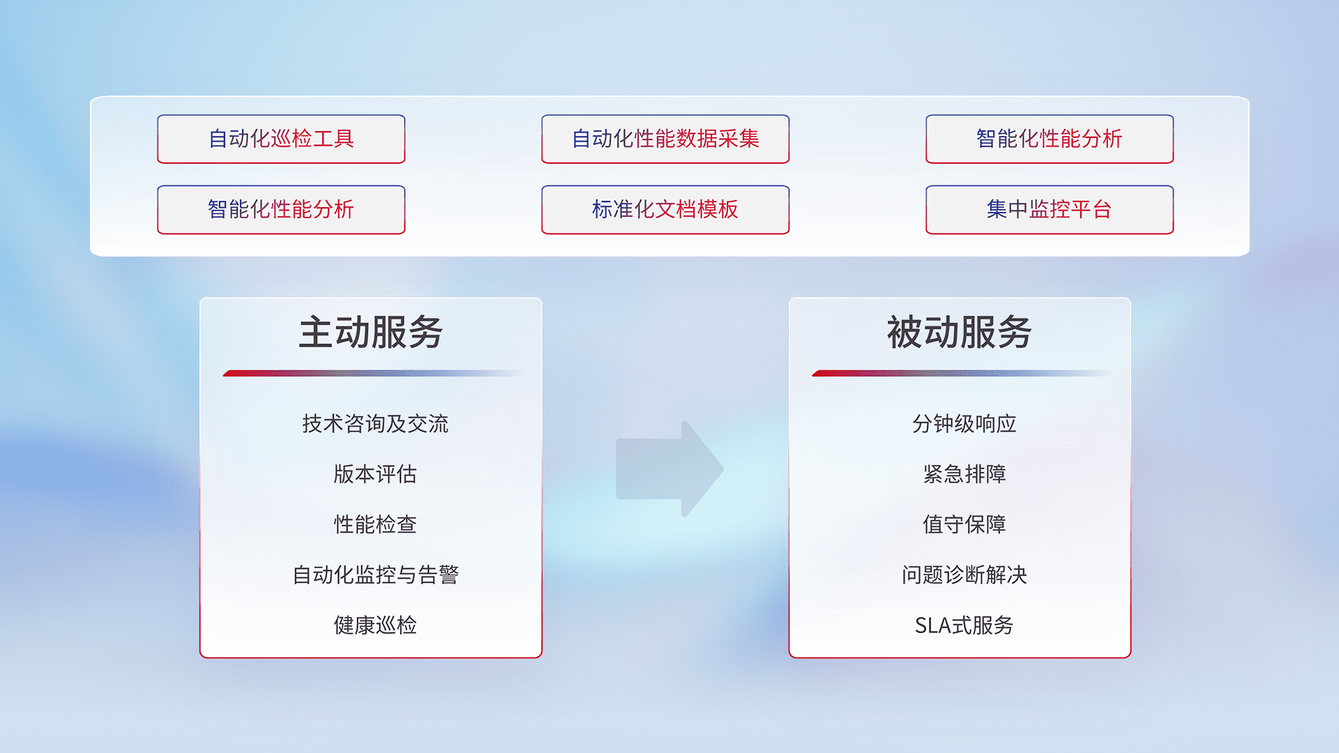 智能化工具和标准化文档,,,保障服务质量,,提供主动服务(包含技术咨询、、、、版本评估、、性能检查、、、自动化监控与告警、、、健康巡检)和被动服务包含(分钟级响应、、紧急排障、、、、值守保障、、、、问题诊断解决、、、SLA服务)。。